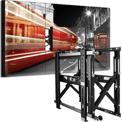 Designed to make video wall installations as quick and simple as possible, this modular video wall mount can be used to create unlimited video wall configurations in both landscape and portrait format. The video wall mounting solution features a pop-in, pop-out system which enables quick and easy access to the rear of mounted screens for